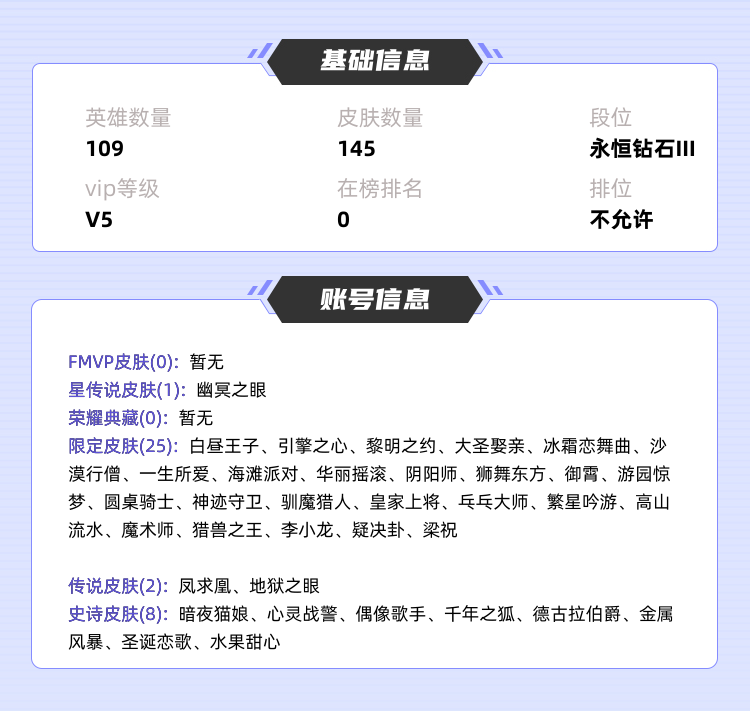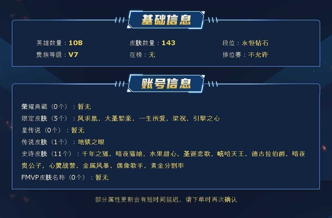 限制: 租号30次及以上 |装备描述:>>>>>>毁号,涉及毁坏虚拟财产罪及计算机安全罪,请文明游戏素质游戏,让我们共建美好租号平台>>>>>> 本游戏账号: V6用户,基础段位:永恒钻石V,英雄多,皮肤多。 私人所属英雄皮肤有:李白 凤求凰||宫本武藏 地狱之眼达摩 沙漠行僧||雅典娜 黎明之约||庄周 高山流水||鲁班大师 乓乓大师||裴擒虎 李小龙||盾山 圆桌骑士||明世隐 疑决卦||兰陵王 驯魔猎人||蔡文姬 繁星吟游||上官婉儿 梁祝||钟馗 神迹守卫||鲁班七号 狮舞东方||嬴政 白昼王子||干将莫邪 冰霜恋舞曲||孙悟空 大圣娶亲||露娜 一生所爱||吕布 猎兽之王||太乙真人 华丽摇滚||米莱狄 御霄||甄姬 游园惊梦||狄仁杰 阴阳师||狄仁杰 魔术师||赵云 皇家上将||赵云 引擎之心||项羽 海滩派对,等等 注意事项: A.游戏过程中请不要恶意挂机或者不文明发言;B.恶意挂机、顶号等行为将被拉黑无法再次下单;C.进入游戏后中途请勿退出登陆,否则无法再次上号;D.部分账号由于异地登录可能会出现密码错误提示,通常再尝试5-6次后可上号。 |||||||||>喜欢本账号请点 ☆收藏☆ 方便下次租用,谢谢光
