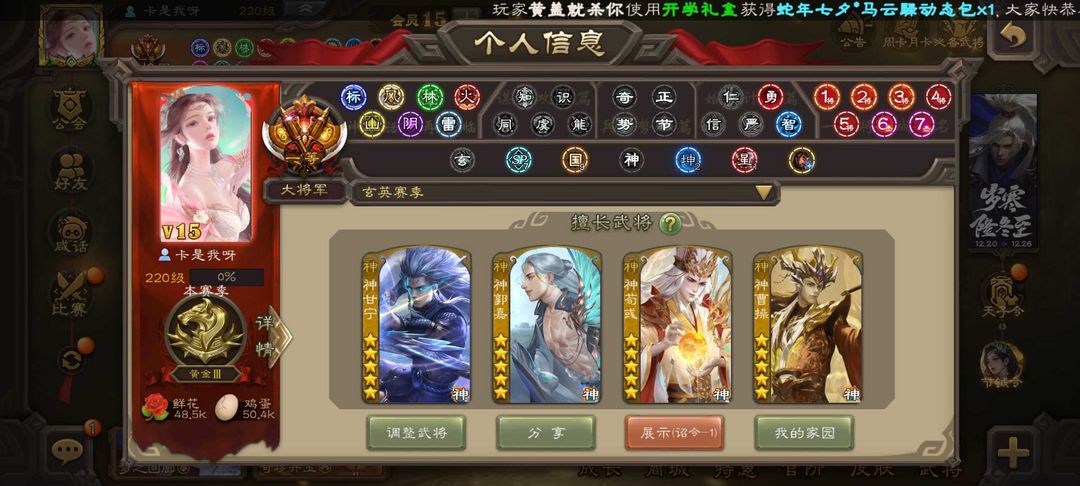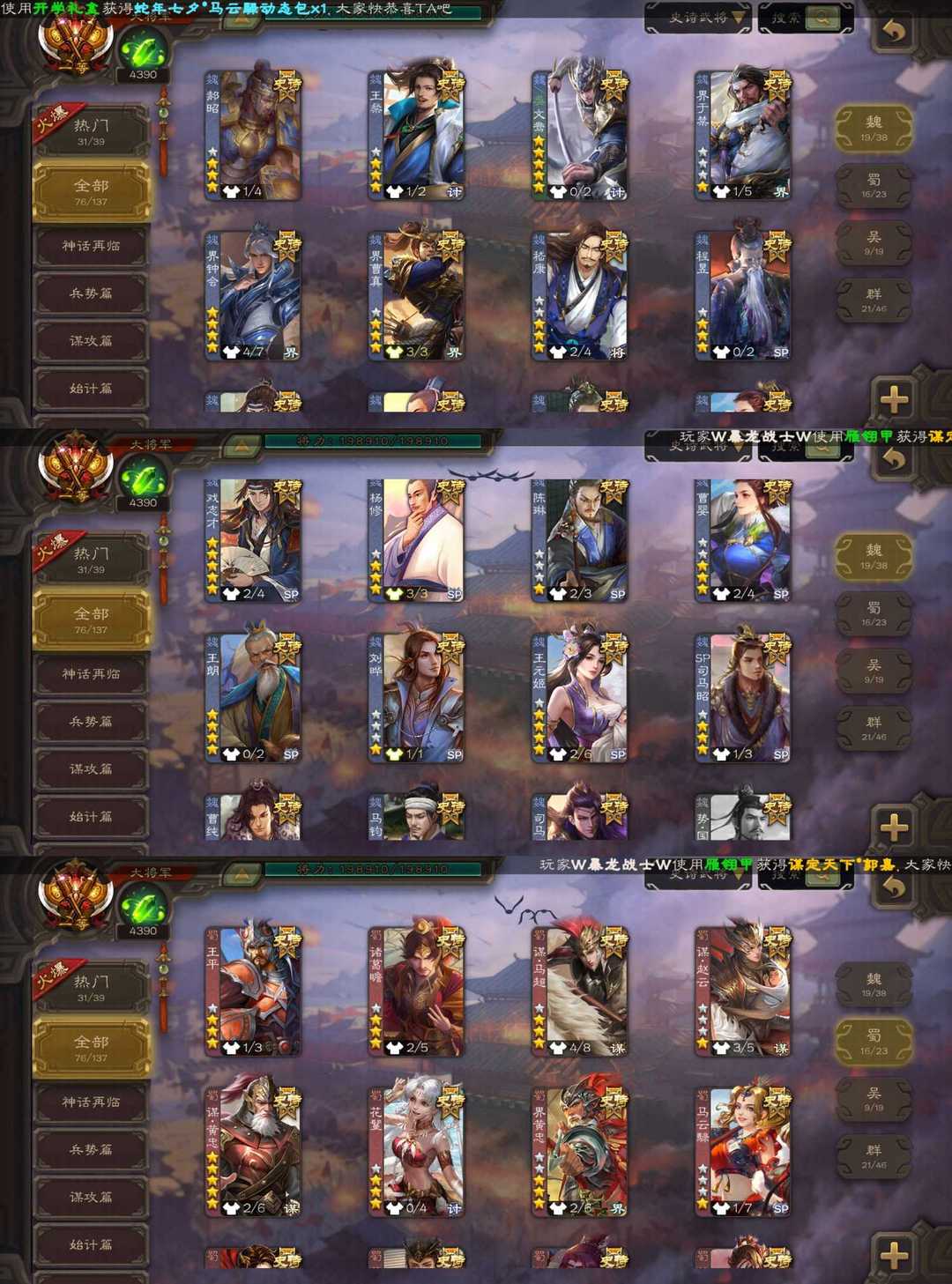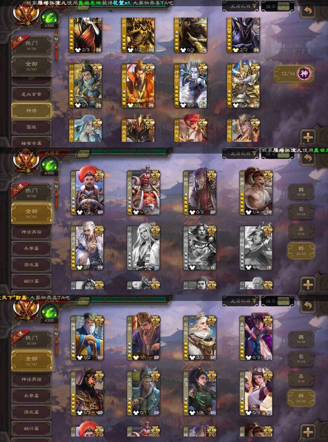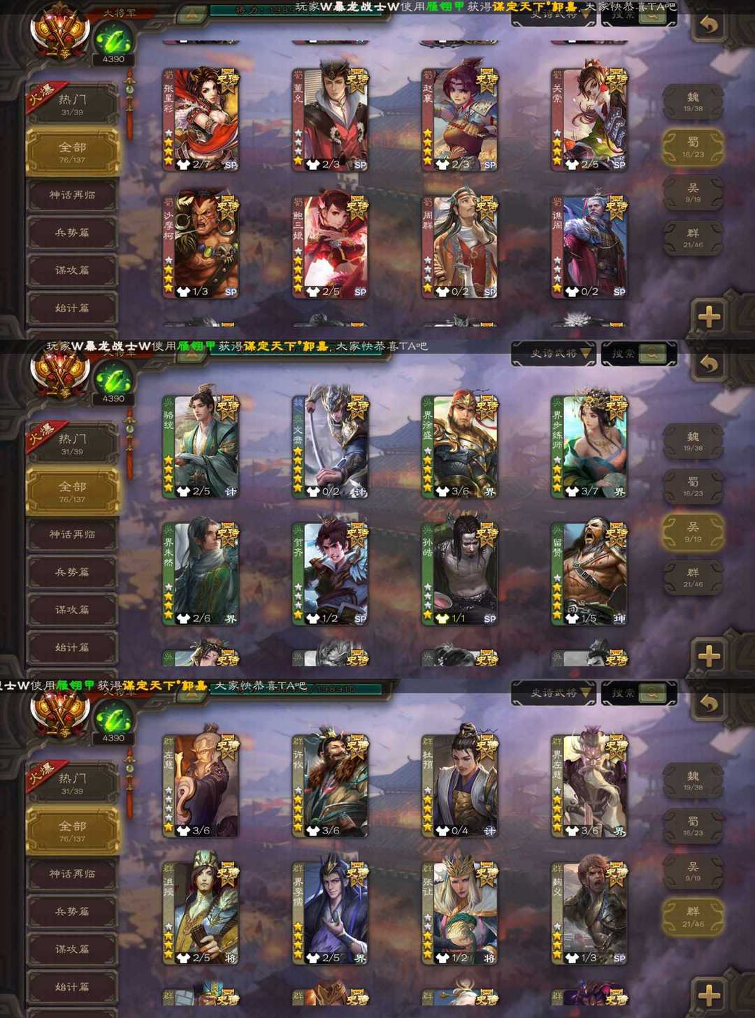 装备描述:魏国⚡郝昭⚡王粲⚡文鸯⚡界于禁⚡界钟会⚡界曹真⚡嵇康⚡程昱⚡戏志才⚡⚡杨修⚡陈琳⚡曹婴⚡王朗⚡王元姬⚡刘晔⚡SP司马昭⚡曹纯⚡马钧⚡司马师⚡ 蜀国⚡王平⚡诸葛瞻⚡谋马超⚡谋赵云⚡谋黄忠⚡花鬘⚡界黄忠⚡马云騄⚡张星彩⚡董允⚡赵襄⚡关索⚡沙摩柯⚡鲍三娘⚡周群⚡谯周⚡ 吴国⚡骆统⚡界徐盛⚡界步练师⚡界朱然⚡贺齐⚡孙皓⚡留赞⚡孙寒华⚡ 群雄⚡左慈⚡许攸⚡杜预⚡界左慈⚡沮授⚡界李儒⚡张让⚡麹义⚡陶谦⚡士燮⚡司马徽⚡卑弥呼⚡刘焉⚡王允⚡苏飞⚡张琪瑛⚡公孙康⚡兀突骨⚡杨彪⚡祢衡⚡庞德公⚡ 神将⚡神曹操⚡神吕布⚡神赵云⚡神司马懿⚡神陆逊⚡神刘备⚡神甘宁⚡神张辽⚡神郭嘉⚡神太史慈⚡神孙策⚡神荀彧⚡ 排位142 国战113-